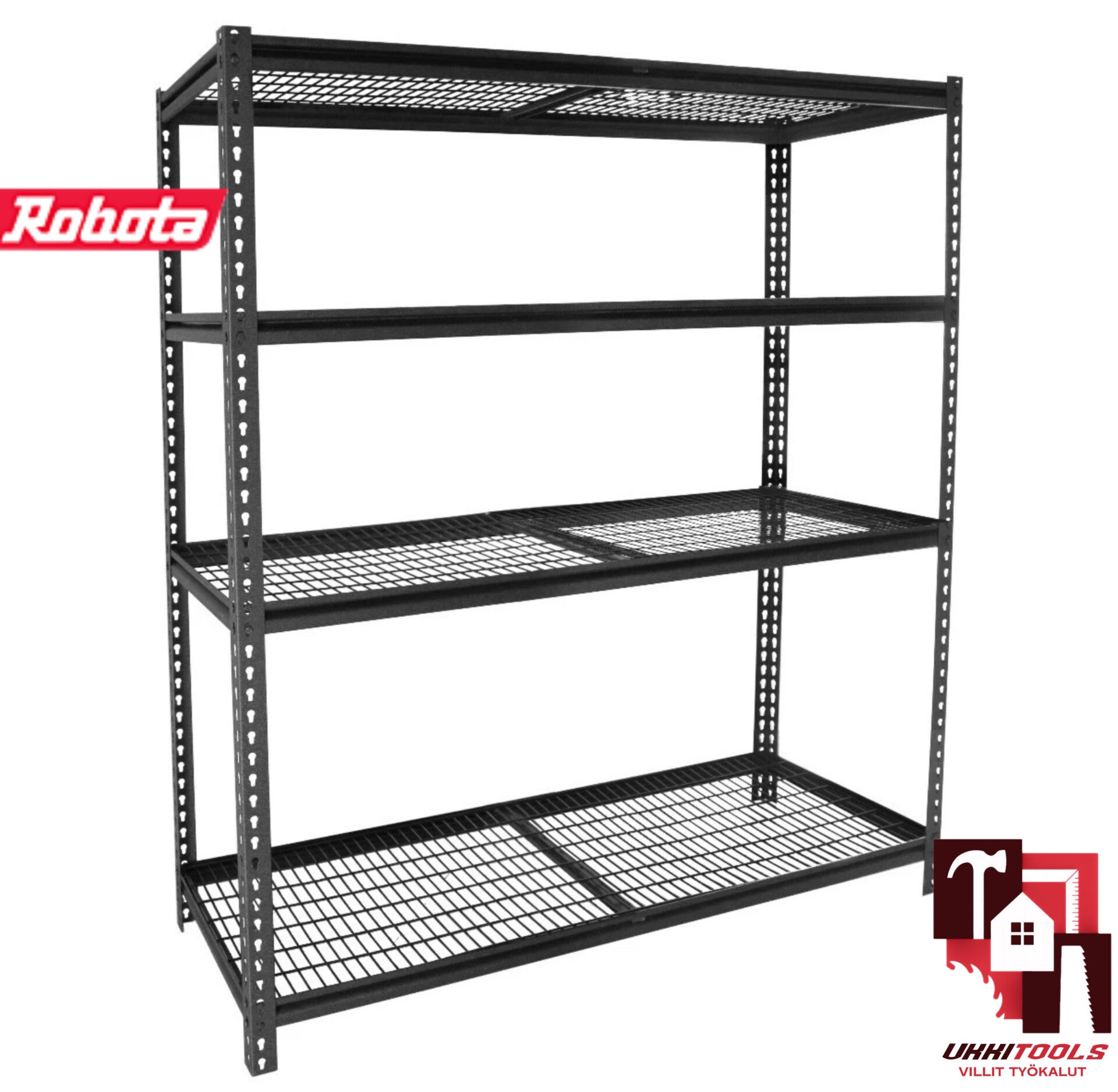 Robota Jämerä sarjan MAXI varastohylly on vahva ja pitkäaikainen investointi varastointiin. Hyllyssä on tukeva teräksinen runko ja vaakapalkit. Vaakapalkkien väliin asetetaan teräsverkosta tehdyt hyllytasot. Verkon etu perinteiseen vaneriseen tasoon on sen kesto. Voit huoletta käyttää hyllyä myös tilassa, jossa on kosteutta ja hylly ei pehmene. Hylly on kauttaaltaan pulverimaalattu, joka takaa ettei se ruostu. Hyllyssä on neljä siirrettävää hyllytasoa joiden kantavuus on 300kg per taso. Pakkauksen koko 185x60x10cm ja hyllyn koko kasattuna 183x183x53cm