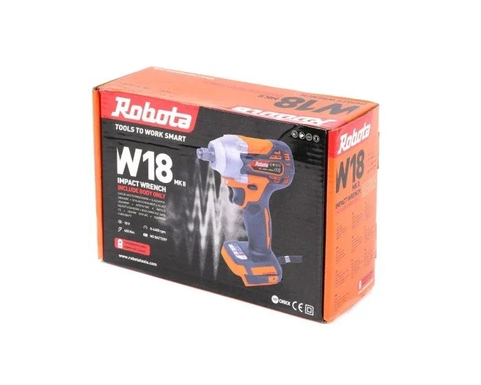 Robota DC-18V sarjan W18 akkumutterinväännin on oikea voimanpesä. Sen tarjoama vääntö aukaisee tiukimmatkin auton renkaan pultit. Voit käyttää W18 konetta myös muiden pulttien ja mutteriden avaamiseen ja aukaisuun. Koneessa on kuparikäämitty tehokas moottori joka pyörittää 1/2” vääntiötä. Vääntiön ja moottorin välissä on momenttiosa joka takaa, ettei kone pääse särkymään. Koneessa on LED kohdevalo joka valaisee työstettävän kohteen. Koneen tehoa voidaan säätää akkukengän yläpuolelta olevasta näppäimistöstä. Kone on varustettu rannelenkillä ja siinä on miellyttävä kumigrippi sekä kumisuojat mikäli kone pääsee putoamaan maahan. Pienet kolhut ei tätä konetta haittaa, sillä Robota robottaa varmasti!