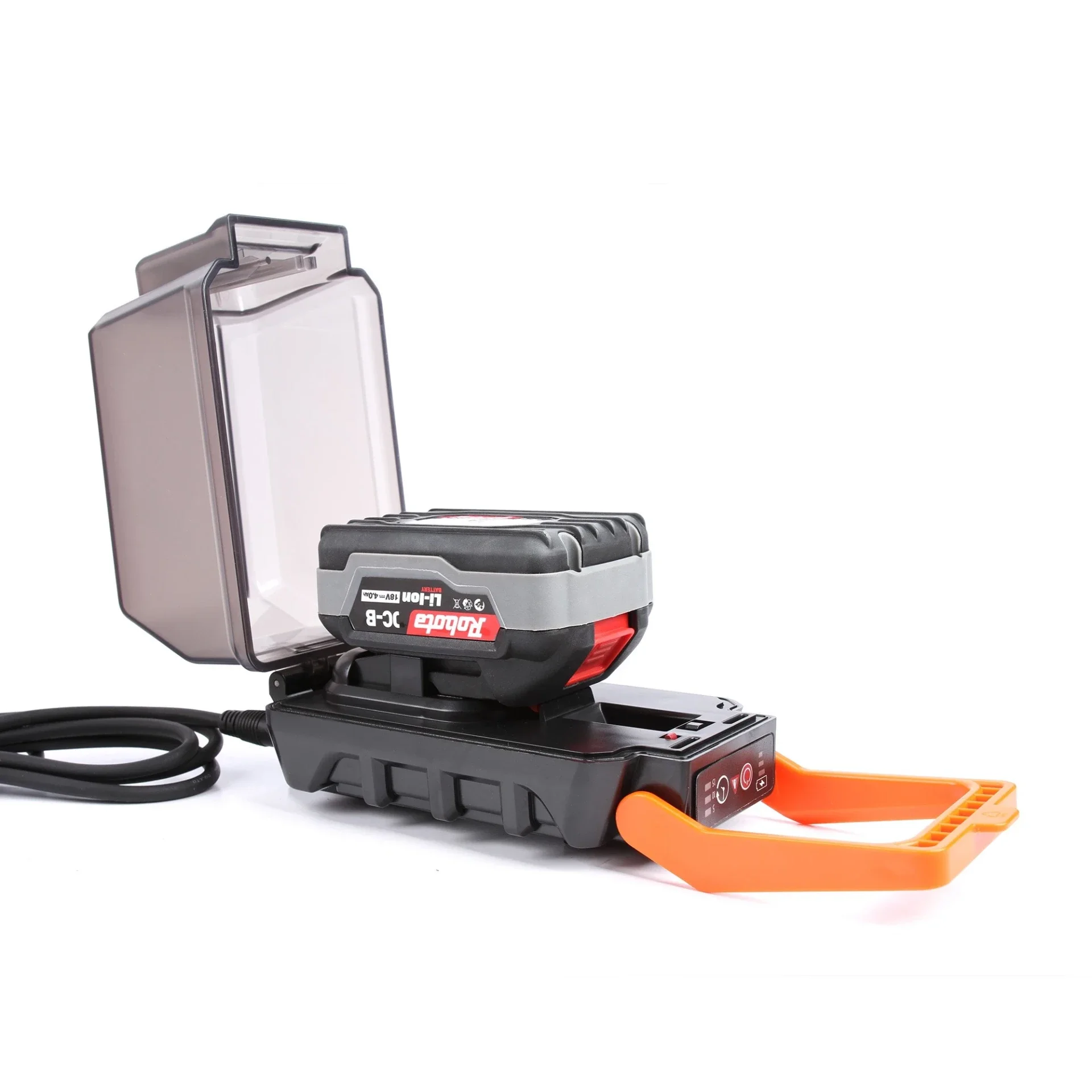 Pumppu toimii Robotan 18V akuilla tai Makitan LXT 18V akuilla. Pumpun erillisessä akkuyksikössä akku on suojattuna kannen alla. Pumppu liitetään virtajohdolla yksikköön kiinni.