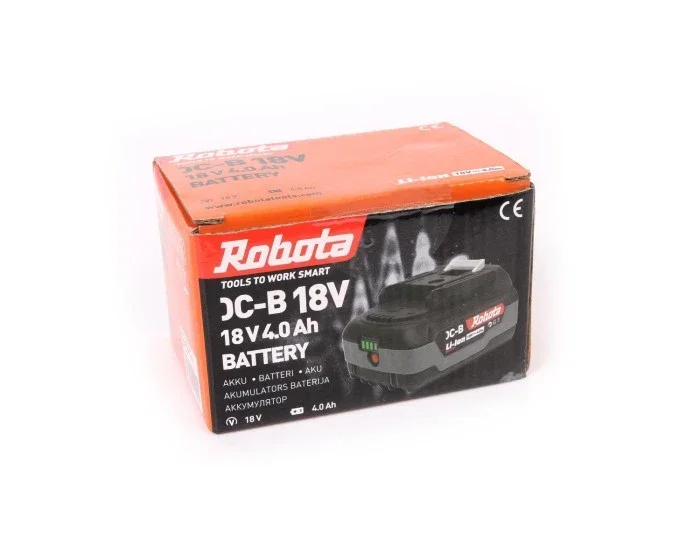 Robota Li-Ion akku Robotan 18 V akkutyökaluille. Akun varaustilan näyttö Led-valoilla.