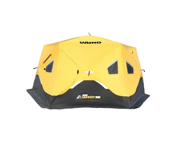 Jättikoinen Väinö Bunker Thermal XXXL Pop-up pilkkiteltta, joka on nopea pystyttää ja purkaa. Teltassa PVC ikkunat jotka on peitettävissä läpällä. SBS vetoketjut takaavat ovien toiminnan kylmässäkin kelissä. Teltassa ilmastointi venttiilit joiden avulla kosteudesta pääsee eroon. Runkorakenne 11.0mm kestävää lasikuitua. Materiaali on erikois Thermal Fabric-3Layer eli kolmikerros 300D Oxford jonka päällikangas on PVC pinnoitettu telttakangas, välissä eristyskerros ja sisällä vuorikangas. Teltta on 10000mm vedenpitävä. Avonainen pohja ja kulmissa kiinnikkeet teltan ankkuroimiseen jäänkanteen. Katossa 2 läpivientiä kamiinan piipuille. Mukana tulee säilytys/kantopussi.