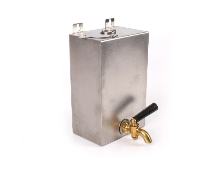 Ruostumattomasta teräksestä tehty lämminvesivaraaja. Tilavuus n.4 litraa. Kiinnitetään kaminaan yläreunassa olevilla kiinnikkeillä, suunniteltu mallin 120 kamiinaan.